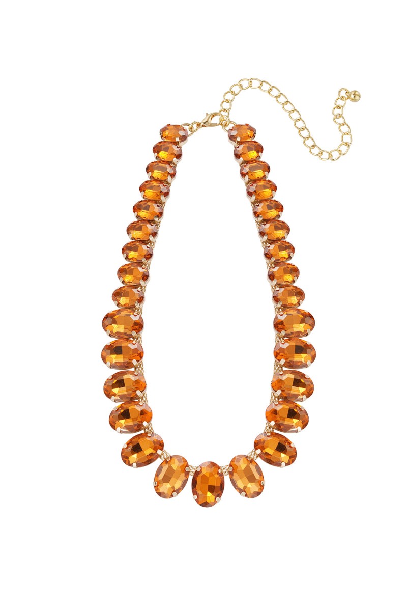 Hoe leuk is deze gouden ketting met grote oranjee ovalen glanzende stenen! Mega trendy en perfect te combineren met meerdere leuke kettingen! De ketting is daarnaast superleuk te combineren met meerdere glanzende sieraden en accessoires. De ketting is gemaakt van koper in combinatie met glaskralen. De ketting heeft een lengte van 38 cm, verstelbaar tot en met 52 cm.