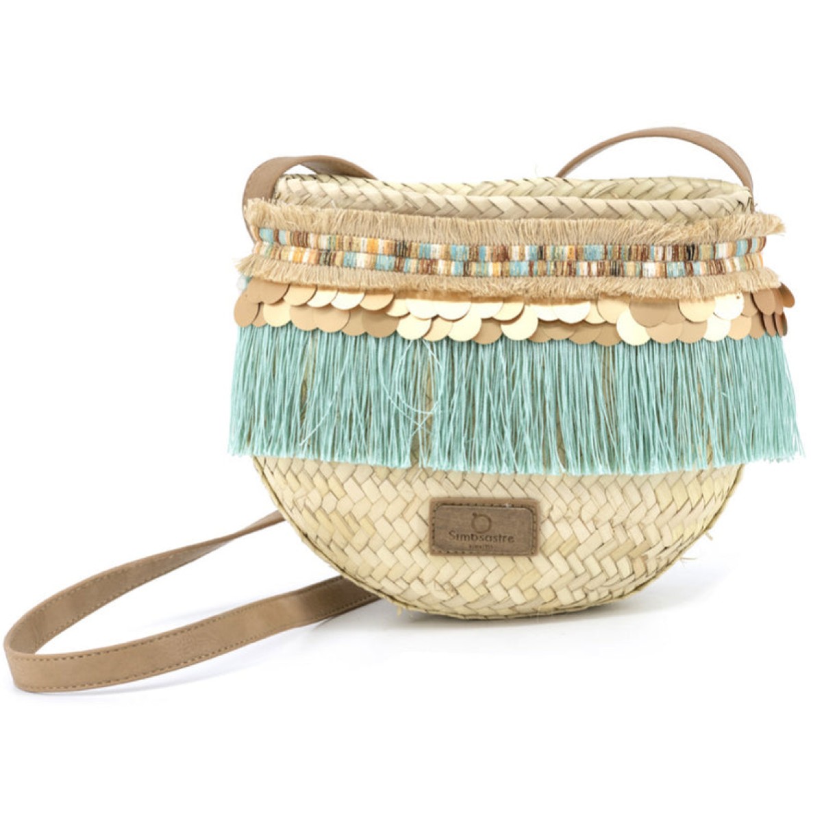 Deze geweldige handgemaakte tas komt uit de 'Queen Jade Blue' lijn. Deze tas is gemaakt van gevlochten palmbladeren met ritssluiting, vegan poly lederen schouderriem en voering met binnenvak. Dubbel gedecoreerd met horizontale versieringen in aarde- en jade-tinten, twee rijen goudkleurige munten en gekleurde franjes.